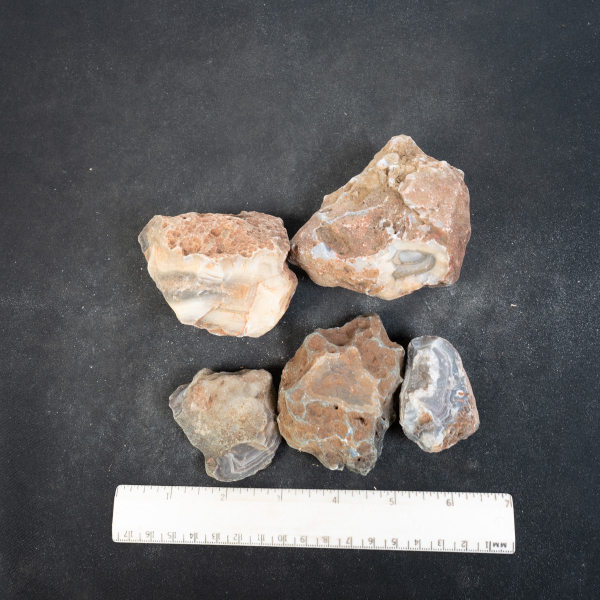 Rough Botswana nodules weighing a combined 2 pounds for trim saw cutting. Will produce nice jewelry pieces or smaller specimens. Fun to cut.