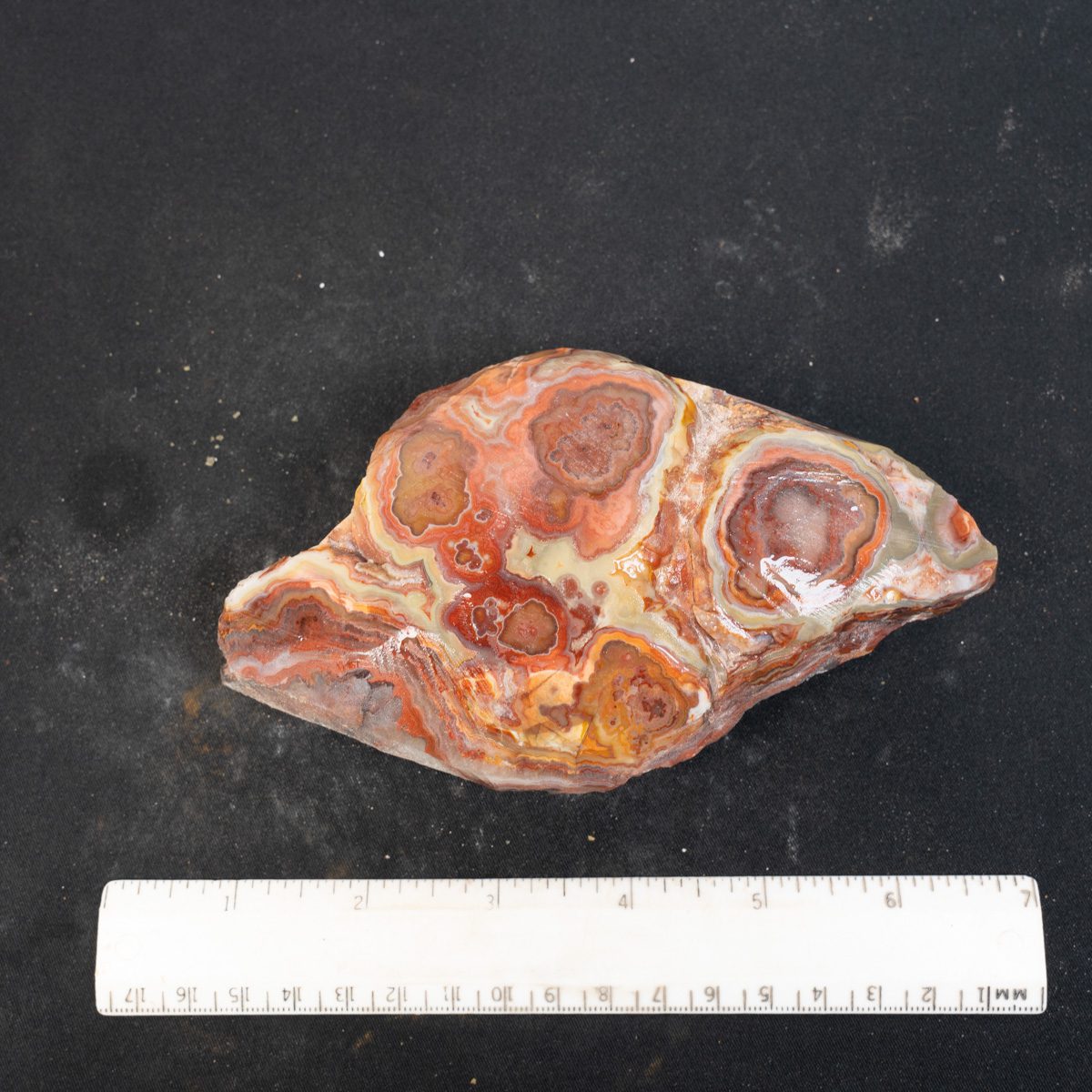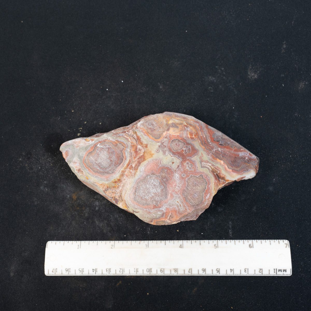 This is a crazy lace agate specimen from Mexico. The botryoidal protrusions have been ground to reveal the beautiful eyes. It is ready to place in your tumbler to produce an exceptional specimen. It is pictured wet and dry and back.